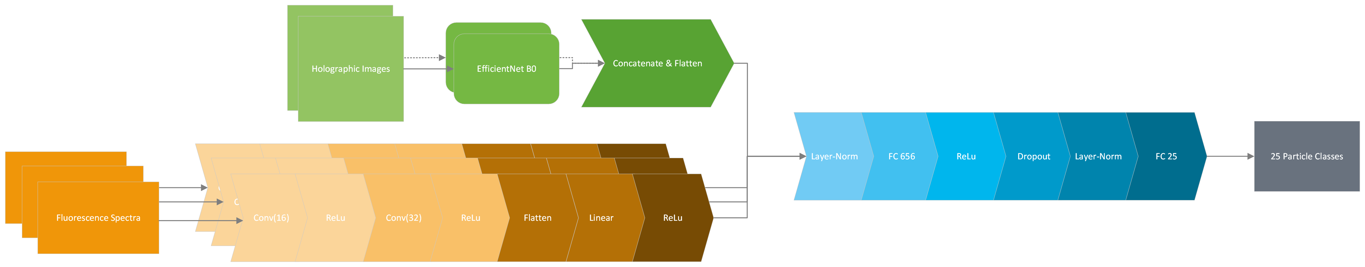 The graph above shows the model architecture of the multimodal classifier. The model combines holography images (green trail) and fluorescence spectra (orange trail) to improve the classification quality of pollen particles.